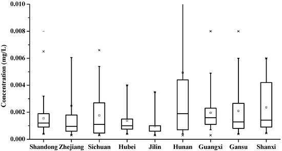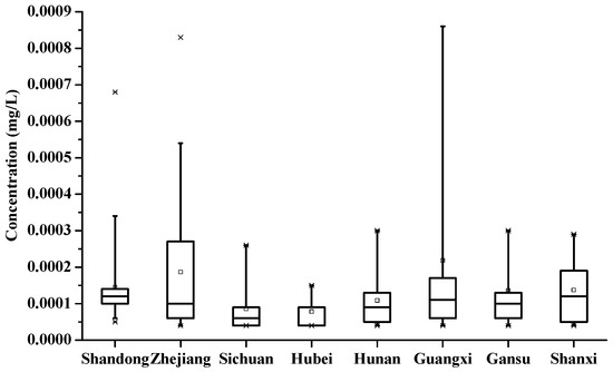 Boxplot of discharge concentrations of Hg from different regions WWTPs. Note: Because there was not enough data from Jilin WWTPs, so there was no boxplot for Jilin. “□” stands for average value, and “×” stands for 95% percentiles.