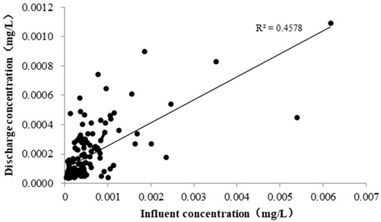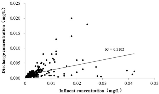 The relationship between the concentrations of influent and effluent was analyzed (Figure 8 and Figure 9). The results show that the linear relationship between the concentrations of influent and effluent is weak (R2 < 0.5). Gbondo-Tugbawa et al. [26] also reported that there is no significant relationship between the mercury influent concentration and effluent.