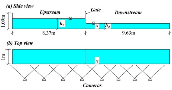 The flume was made of tempered glass supported by a steel frame. The upstream was 8.37 m long, and the downstream 9.63 m long. The width was 1 m, and the height was 1.09 m. The flume had a rectangular cross section and a flat bottom. The gate material was a 15-mm-thick fiberglass board, which was lifted instantly by the electromagnetic brake asynchronous motor. This method was used to simulate the instantaneous break of the dam. The lifting time was 0.27 s when the upstream water depth was 0.6 m, which satisfies the following transient failure condition []: t < (2hu/g) 1/2 = 0.3499 s (hu is the upstream water depth, and g is the gravity acceleration, 9.8 m/s2). Eight CCD (charge coupled device) cameras were arranged in parallel at the side of the flume at a distance of 1.4 m to capture the evolution of the water flow. To ensure the quality of the video and make it more convenient to use the image processing technology, the background was covered with a smooth white car sticker, and the water was dyed in the experiment. To avoid noise from the reflection of the flume glass during image processing, a light-colored curtain was arranged on both sides of the flume to eliminate the shadow caused by natural light. In the experiment, 8 CCD cameras were simultaneously turned on by a wireless remote control. A wide-angle lens with a resolution of 1440 × 1920 was used for shooting, and the shooting speed was 48 frames per second. The device schematic is shown in Figure 1.