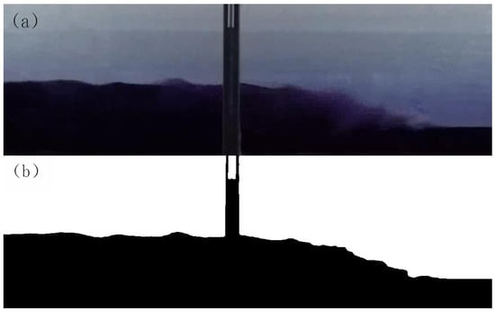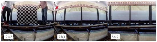 The process of experimental data acquisition is divided into two main steps: the first step is to obtain the external and internal parameters of each camera by using the calibration plate and the calibration toolbox in MATLAB (MATLAB2016a, Mathworks company, Natick, MA, USA) and then to use the data and the corresponding calibration function to re-project and obtain the undistorted image. The second step is to analyze the image based on the undistorted image. In addition, the calibrated picture is then cropped and merged using the ruler above the flume. After binarizing the image, the water depth at each location can be obtained by boundary recognition functions. The calibration plate is shown in Figure 2a. The size of the square lattice in the plate is 100 mm × 100 mm. The number of grids is 11 on one side and 10 on the other. A margin of 50 mm is left around the calibration plate for the calibration toolbox to recognize the corner points so that the internal and external parameters of each camera can be accurately obtained to better correct the distortion. A set of 25 pictures in different orientations and angles is used to calibrate each camera, and the pictures before and after calibration are shown in Figure 2b,c. The actual length represented by one pixel is approximately 1.8 mm, and the depth of the part blocked by the flume steel column is obtained by interpolation. The picture after clipping and binarization is shown in Figure 3.