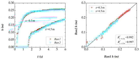 To ensure the stability and accuracy of the experimental data collection, the repeatability of the experiment is verified here by repeating the conditions of hu = 0.6 m and hd = 0 m and comparing the depth data at positions of x = 0.3 m (near the dam) and x = 4.5 m (far from the dam). The results are shown in Figure 4, where Run 1 and Run 2 represent the first and second experiments for the conditions of hu = 0.6 m and hd = 0 m, respectively. It can be seen that the overlap of the data between the two groups is quite good, and R2 is close to 1, which proves that the experiment has good repeatability.