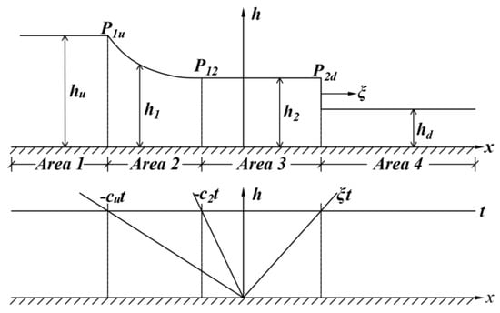 For convenience of later description, the analytical solution of 1D GWM is simply explanation here. Martins divided the structure of dam break into four areas, as shown in Figure 5, where P1u and P12 represent the first and second weak discontinuity point, respectively; P2d represents the strong discontinuity point; ξ represents the downstream wave-front evolution velocity; h1 and h2 represent the water depth in the rarefaction wave zone and the steady zone, respectively; Cu and C2 represent the velocity of the first and second weak discontinuity point, respectively.