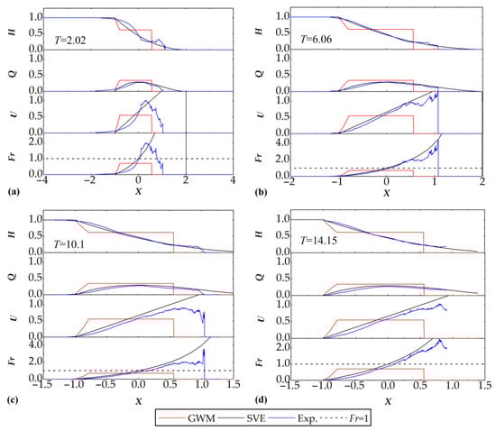 Water depth, flow discharge, average velocity and Fr for dry bed downstream: (a) T = 2.02; (b) T = 6.06; (c) T = 10.1; (d) T = 14.15.