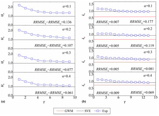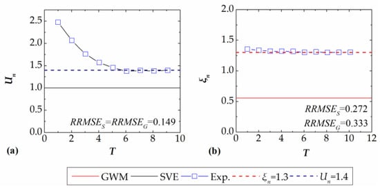 The calculation results of the upstream negative wave and the downstream wave-front velocities are shown in Figure 7, where Un represents the dimensionless upstream negative wave evolution velocity and ξn represents the dimensionless downstream wave-front evolution velocity. Here, the relative root mean square error (RRMSE) is used to compare the error between the calculated value and the experimental value. The formula is as follows: