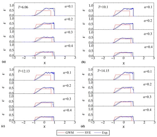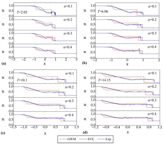 Different degrees of water jump will occur downstream for the initial dam break (T = 2.02). It can be seen from Figure 8a that neither the SVE nor the 1D GWM describes this phenomenon well. Stansby et al. also observed that a mushroom-like jet occurs downstream of the initial dam break in the case of a wet bed downstream, and found that the movement form is quite complicated, but after the wave is broken, the motion of the water flow has good agreement with the analytical solution of the shallow water equations []. It can be seen from Figure 8 that the conclusion is still valid when the water depth ratio is between 0.1 and 0.4.