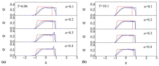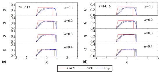 In the case of wet bed downstream, the downstream water surface is distorted in the initial stage of dam break. The leaping water body will spin and aerate, and there will also be holes in the water body when it evolves downstream. Thus, the shape of the water surface line is complicated and not easy to capture. The flow discharge obtained by the above method cannot accurately describe the actual change, so the calculation of flow discharge in the case of wet bed downstream starts from T = 6.06. The calculation result is shown in Figure 9. It can be seen that due to the shortening of the rarefaction wave zone calculated by the 1D GWM, there is a significant deviation from the experimental value throughout the evolution period. The flow discharge in the steady zone is larger than the experimental value, but it can be seen that with the water depth ratio increased, the flow discharge value calculated by the 1D GWM in the steady zone also gradually approaches the experimental value.