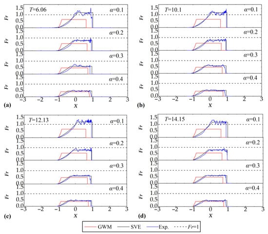 The calculation results for Fr are shown in Figure 11. As described above, when α = 0.1, the Fr value calculated by the 1D GWM is less than 1 in the entire flow region, and the Fr of the actual flow is greater than 1 in the steady zone. At this time, the second weak discontinuity point will not propagate upstream, and the description of the 1D GWM is flawed. When α = 0.2~0.4, Fr is less than 1 in the whole flow region, and the flow is in a subcritical flow state. The result of the 1D GWM calculation still differs greatly in the rarefaction wave zone, and the Fr calculated in the steady zone is smaller than the experimental value. However, it also has the characteristic that its value gradually approaches the experimental value as the water depth ratio increases.