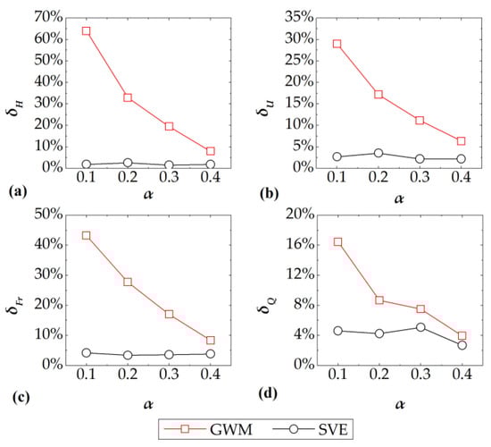 The calculation result is shown in Figure 12, where δH, δU, δFr, and δQ represent the errors in the water depth, average velocity, Fr and flow discharge in the steady zone, respectively. It can be seen from Figure 12 that with increasing water depth ratio, the error between these hydraulic parameters and the experimental values tend to gradually decrease. When α = 0.4, the errors for water depth, average velocity, Fr and flow discharge are 7.91%, 6.32%, 8.36%, and 3.94%, respectively.