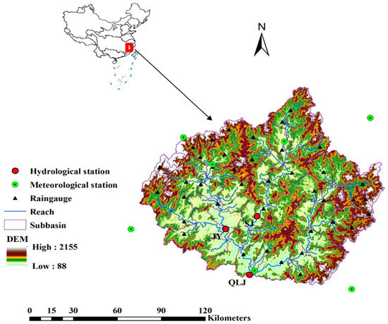 The Minjiang River Basin is located in the north of Fujian province, between 116°23′ E and 119°43′ E longitude, 25°23′ N and 28°19′ N latitude. The study area of this paper is Qilijie Basin, a subbasin in the upper Minjiang River Basin and covers an area of 14,800 km2 (Figure 1). Qilijie Basin is located within subtropical monsoon climate region. The precipitation in the basin is abundant, with an average annual rainfall of 1851 mm. Most of the precipitation (about 60%) falls between April and June. The average annual runoff is 1134 mm, and the annual average rainfall-runoff coefficient is about 0.53. Most of the floods in the study area were caused by plum rain in April to June and typhoons from July to September. There is no large reservoir in this basin, so we did not need to consider reservoir regulation. Majority of the soils in the basin are Haplic Acrisols (60.3%), Cumulic Anthrosols (15.6%) and Humic Acrisols (12.2%). There are six kinds of land cover/land use, and the top three are forest (65.17%), agriculture (19.26%) and pasture (14.45%). The details of soil and land use/land cover were presented in Figure 2a,b, respectively.