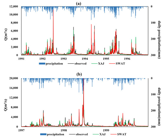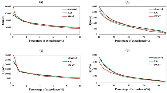 We also plotted flow duration curves (FDCs) in Figure 4 to evaluate the agreement between observations and simulations. Both the XAJ and SWAT models overestimated extreme high flows (<1% exceedance) during calibration and validation periods, and it was further obvious in the SWAT model. While the SWAT model could capture high flows (~2% exceedance) perfectly. During the calibration period, the SWAT model predicted better in terms of medium flows (~50% exceedance) but had a poor performance in terms of low flows. During the validation period, it was the opposite. The XAJ model performed satisfactorily in estimating medium flows while the SWAT model had better agreement in low flows. Both of the two models overestimated high flows and underestimated low flows as a whole. The models responded differently to extremely high and extremely low flows. Therefore, the responses of the models to different conditions [39,40,41] need further study.