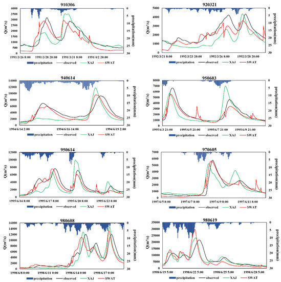 Calibration and validation of the sub-daily SWAT model in flood simulation were conducted using SWAT-CUP and a few modifications were made to it to accommodate the hourly time-scale input. The results of calibration and validation for XAJ and the sub-daily SWAT model are listed in Table 5. During the calibration period, the sub-daily SWAT model performed better than the XAJ model with R2 ranging from 0.5 to 0.89 and NSE ranging from 0.33 to 0.85, compared with 0.07 to 0.92 and 0.2 to 0.92 of R2 and NSE for the XAJ model, respectively. During the validation period, both of these models improved. The average R2, NSE and PBIAS for the SWAT model was 0.73, 0.56 and −6.76, respectively, and the average R2, NSE and PBIAS for the XAJ model was 0.65, 0.50 and −2.88, respectively. Generally, the SWAT model did better than the XAJ model according to R2 and NSE. The results of NSE values were better than a previous study [18], as the model had been calibrated and validated over flood periods only.