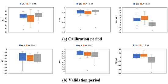To evaluate the effect of spatial scale on the SWAT model, the team took JY and SJ station as an example. Their locations are marked in Figure 1 and the basic information of these three stations is presented in Table 6. The catchment areas of JY and SJ station were much smaller than the area of QLJ station. There were also some differences in their land use and soil types. We simulated floods in JY and SJ stations using the parameters calibrated by QLJ station and calculated R2, NSE and PBIAS for each flood. Figure 6 shows the boxplots of R2, NSE and PBIAS for these three stations. During the calibration period, R2 and NSE of these stations did not change much. However, they had a different reaction according to PBIAS. The PBIAS values of QLJ and JY station were 13.06 and 18.42, respectively, while the PBIAS value of SJ station was −6.28. It is implied that the SWAT model underestimated flow regimes in QLJ and JY stations but overestimated flow regimes in SJ station. On the whole, SJ station behaved the best during the calibration period. During the validation period, the SWAT model performed better in QLJ station. JY station showed good consistency with QLJ station while SJ station had the worst performance.