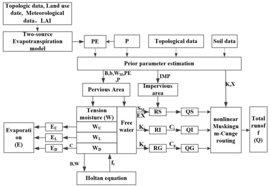 Evapotranspiration is a significant part of the hydrological cycle and is mainly affected by the soil vegetation system and weather conditions. In the classic XAJ model, the actual evapotranspiration (AE) is calculated by PE multiplied by a certain coefficient, which is determined by the soil moisture conditions. The PE is a fraction of the pan evaporation observations. However, this empirical calculation of PE cannot reflect the influences of and variation in the vegetation cover and land use. Ren and Guo [9] and Wang et al. [10] pointed out that the evaporation value measured by the evaporating dish is not always consistent or even negatively correlated under different environments. Penman [11] proposed an evapotranspiration method that considers energy and water transport mechanisms. Monteith [12] introduced aerodynamic resistance and surface resistance to calculate the evapotranspiration rates of different types of vegetation. The formula is named Penman–Monteith [13] and is widely used in hydrometeorological models. To calculate soil evaporation, Choudhury and Monteith [14] proposed the Choudhury–Monteith two-source evapotranspiration model (TSPE), which is better than the Penman–Monteith formula and is consistent with measured values. Yuan et al. [15] developed a hybrid form of the distributed model by integrating a physically based TSPE model with the GXAJ model. The TSPE model explicitly represents the spatiotemporal heterogeneity of PE, including potential CT, potential SE, and IE. The PE was then directly used to drive the Xinanjiang model to perform the streamflow simulation.