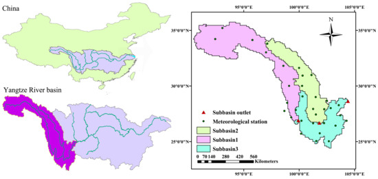 The Jinshajiang River basin is the source of the Yangtze River Basin and is located in southwest China. The Jinshajiang River flows through the Tibet, Qinghai, Sichuan, and Yunnan provinces. The basin is characterized by broad climate zones, varying from humid to semi-arid environments, and has a large drainage area of 458.8 × 103 km2. The mean annual temperature ranges from −4.5 °C to 16.4 °C. The total annual rainfall varies from 321 to 1662 mm. Approximately 85% of the annual total rainfall occurs during the monsoon months, from May to September, with strong spatial and temporal variation. Based on the river network characteristics, the Yangtze River Basin can be delineated into three sub-basins, as illustrated in Figure 3. Sub-basin 1, located in the Southeastern part of the Tibet Plateau, is upstream of the Jinshajiang River. Table 1 and alpine valleys make the region a transition zone from shrubland and grassland to forest. With a high topographic relief, Sub-basin 2, the largest tributary to the Jinshajiang River, has rich water resources. The main vegetation types of this sub-basin are forest, grassland, and cropland. Sub-basin 3, located downstream, is the more populated area and has ample rainfall. This area is covered by forest, woodland, grassland, and cropland. The annual characteristics of the three sub-basins are listed in Table 1.