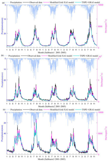 Table 3 presents the performance of the three sub-basins using the modified GXAJ model, the ISER + GRAJ model, and the TSPE + GRAJ model. We evaluated three periods of flood discharge, including the mean annual flow, the dry season flow (January–April, November–December), and the rainy season flow (May–October). In addition, during the dry period, the flood peak was not significant, so PEV and PEP were calculated for the rainy season). Table 3 shows that these three methods achieved satisfactory simulations for the periods of mean annual flow and the rainy season, with NSE values larger than 0.8, and the modified GXAJ model and ISER + GRAJ model performed better than the TSPE + GRAJ model, especially in the semi-arid and semi-humid region (Sub-basin 1). The results of the modified GXAJ model and the ISER + GRAJ model are similar to each other, because, as Wang et al. [10] pointed out, the correlation between the measured results of evaporating dishes in the upper reaches of the Yangtze river and the actual evaporation values is positive. At the same time, the runoff volume in the basin is large, so the difference of evaporation has little influence on the runoff simulation results.