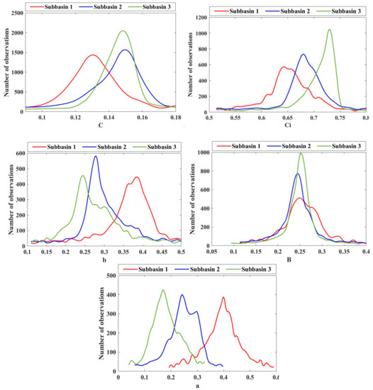 The parameter sets obtained based on uniform distribution were input into the model for the model uncertainty analysis. Figure 5 presents the distribution curves of parameters of the three sub-basins simulated by the modified GXAJ model. According to the figure, the distributions of different parameters at different sub-basins are different, but they are all unimodal. The C parameter of Sub-basin 1 has the largest value, while the C values of Sub-basins 2 and 3 are close. This is due to the low vegetation coverage in Sub-basin 1, and the higher vegetation coverage in Subbasins 2 and 3. Regarding the Ci parameters, the values of Subwatersheds 1, 2, and 3 decreased successively. This may be related to the differences in elevation between the basins. The value of b is mainly related to the area of the basin, which increases with area, and vice versa [26,27]. Here, the distribution of B values is relatively close, with little difference in each subwatershed. Parameter a is related to the average basal area of plant stem. The simulation parameters showed that the values of Subwatersheds 3, 2, and 1 increase successively.