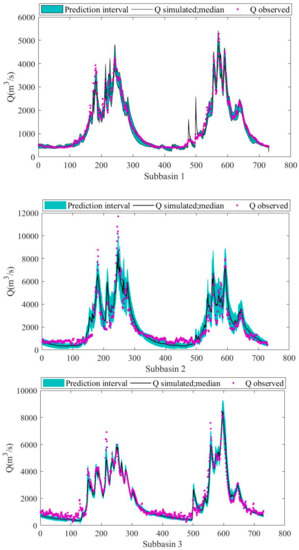 Then, the uncertainty area was analyzed by using runoff simulation results with a likelihood function value greater than 65% [33]. Figure 6 shows the prediction interval, the interval means, and observed values of the three sub-basins. The corresponding evaluation parameters (average relative length (ARIL), average asymmetry degree (AAD), and average deviation amplitude (ADA)) were calculated for quantitative analysis (Table 4). It can be seen from the figure that the uncertainty of Subwatersheds 1 and 3 was small, and their prediction intervals were narrow. However, the uncertainty of Subwatershed 2 was large, and its prediction interval was wide. As can be seen from Table 2, the ARIL value of Subwatershed 2 was up to 0.5, and the model was shown to be uncertain, so the applicability of the model in this region needs to be strengthened.