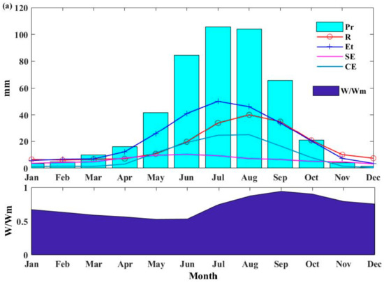 The series of monthly precipitation, runoff, evapotranspiration (Et), CT, SE, and the ratio of the mean tension water storage (W) to tension water capacity (WM) are shown in Figure 7a–c. The maximum monthly precipitation levels of each sub-basin were 105, 155, and 206 mm, respectively. The curve of the runoff hydrograph appeared 1 month after the one of the rainfall in the wet season. The annual evapotranspiration was larger than the runoff at Sub-basin 1 and smaller for Sub-basin 2 and Sub-basin 3. During the period of May to October, the CT exceeded the SE markedly due to the dense vegetation canopy and vice versa. This result shows that the value of W/WM (taken as the soil moisture content) is high from July to November, coinciding with the summer monsoon, while the value of W/WM is low from March to May because of the vegetation growth and infrequent rain. Compared to Sub-basin 1, the monthly soil water contents of Sub-basin 2 and Sub-basin 3 were higher. However, even in the rainy season of the humid Sub-basin 3, the soil was not saturated every day. Therefore, it is necessary to take both IER and SER into account in the rainfall runoff process.