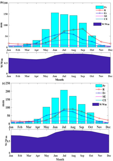 The series of monthly precipitation, runoff, evapotranspiration (Et), canopy transpiration (CT), potential soil evaporation (SE), and the ratio of mean tension water storage (W) to tension water capacity (WM); (a) Sub-basin 1; (b) Sub-basin 2; (c) Sub-basin 3.