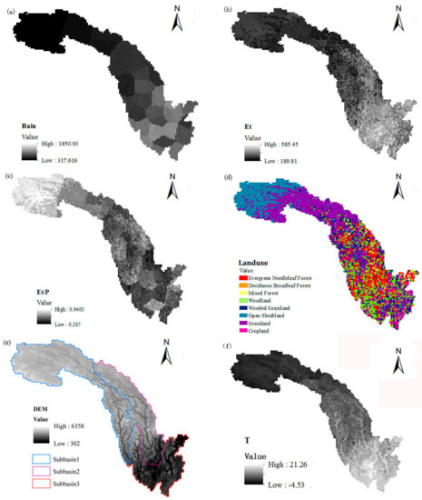 Figure 8a–c show the spatial heterogeneity of the annual average precipitation, evapotranspiration, and fraction of evapotranspiration to precipitation (E/P). The land cover, elevation, and mean annual temperatures are shown in Figure 6d,e. The annual precipitation level indicated a significant spatial heterogeneity in the basin. The greatest amount of rain fell in the valley area of Sub-basin 3, which is the outlet of the total basin. The smallest precipitation occurred in the north of Sub-basin 1, which is located in the Tibetan Plateau. In the intermediate region of the Jinshajiang Basin, the precipitation of Sub-basin 2 was larger than that of Sub-basin 1, even in similar topographies.