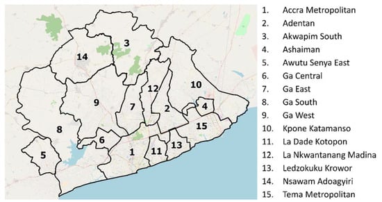 - Ghana Statistical Service. 2010 Population & Housing Census: Accra Metropolitan District Analytical Report; Ghana Statistical Service: Accra, Ghana, 2014. [Google Scholar]