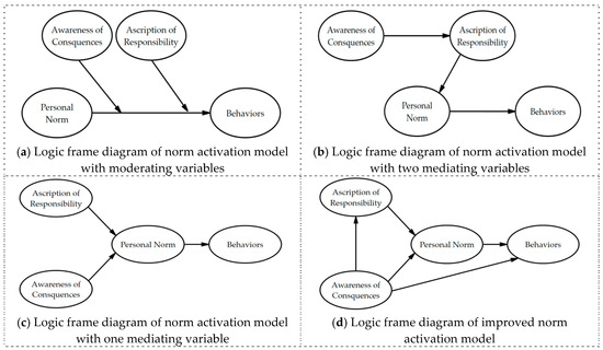 NAM has been improved based on self-completion theory. According to self-completion theory, residents tend to set up goals that suit their identities, and usually have a strong desire to make the outcome conform to their identities through compensatory measures if they fail to reach their goals. Numerous studies show this can protect their moral image [39]. Residents’ attitude toward environment belongs to an element of personal moral image. According to self-completion theory, residents will have strong desire to make their behaviors coincide with their moral images. Therefore, when local residents realize the damages they bring to their environment, they tend to perform compensatory environmental protections to maintain their moral images [40]. Studies have shown that people tend to take compensatory measures and choose a green diet [41] when they recall what they did has destroyed the environment. In this research context, when residents understand the serious consequences of their actions on water environment, the compensatory measure they can take is to accept and reuse recycled water. Thus, the modified standard activation model (improved norm activation model) can be found in Figure 1d.