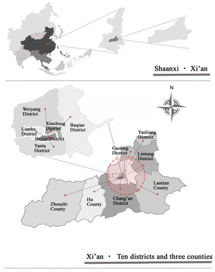 To acquire data for the study, a survey was performed in Xi’an. First, ten investigators received trainings about related basic knowledge. During the period of 16 September–16 October 2016, random investigations were made in the street, central plaza, shopping mall, and parks within different districts and counties in Xi’an. The research sites can be found in Figure 3.