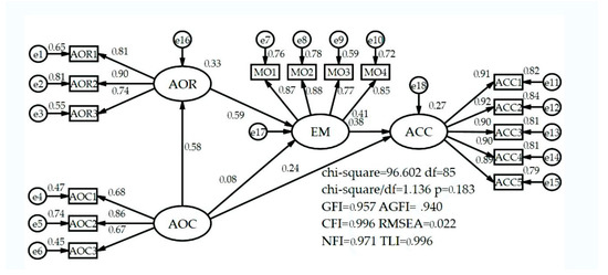 Table 13 indicates both Z values of the path AOC→ACC and AOC→AOR→EM→ACC are greater than 1.96, which means there are significant mediation effects on both paths based on the test with coefficient product method. Meanwhile, 0 is not contained in either minimal value or maximal value of the bias-corrected method and the percentile method. Therefore, we conclude that there is significant mediation effect of the influence path AOC→AOR→EM→ACC and significant direct effect of the influence path AOC→ACC.