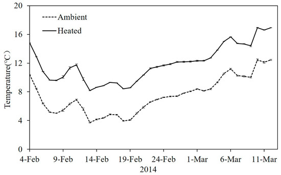 Mean daily temperature in the ambient and heated tanks during the experimental period (n = 6 per treatment) in 2014. Data are means ± standard error (SE).