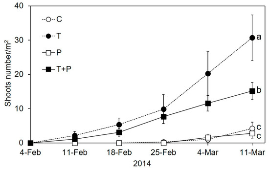 The average number of P. crispus shoots during the experiment in 2014. Abbreviations used: control, C; water temperature was increased 4.5°C compared with the control, T; addition of 50 μg L−1 phosphate every 2 weeks, P; addition of 50 μg L−1 phosphate every 2 weeks and temperature increase of 4.5 °C, T + P. Different letters (a, b, c) indicate significant (p < 0.05) differences. Error bars indicate ± standard error (SE).