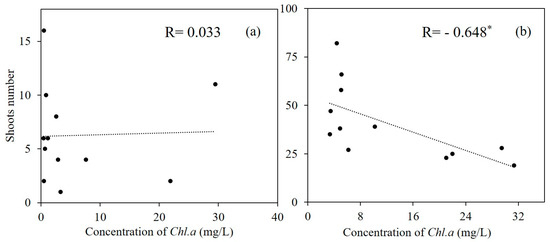 Correlation between concentrations of Chl. a and number of emerged seedlings in March 2014. (a) ambient treatment, (b) heated treatment, * Correlation is significant at the 0.05 level (2-tailed).