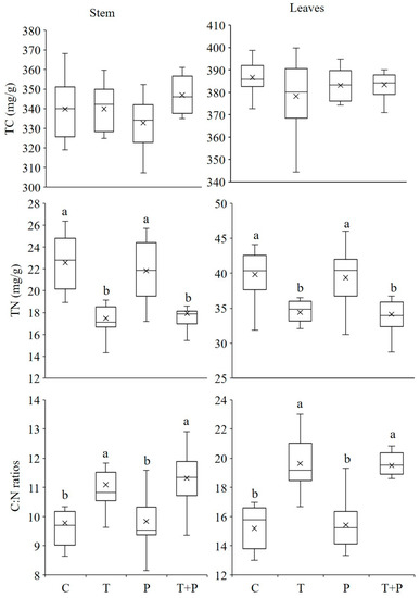There was no difference of TC contents in aboveground parts of P. crispus between different treatments (Figure 4). However, a decrease of TN contents in tissues was found in T and T + P treatments with increasing temperature (Figure 4; one-way ANOVA: for leaves, F344= 8.54, p < 0.001; for stems, F344 = 16.57, p < 0.001), for leaves changed from 22.58 mg/g in C treatment to 17.47 mg/g in T treatment and 17.94 mg/g in T + P treatment, and stems dropped from 39.82 mg/g to 34.30 and 34.14 mg/g in T and T + P treatments, respectively (for leaves, T treatment, p = 0.001, T + P treatment, p < 0.001; for stems, T treatment, p < 0.001, T + P treatment, p < 0.001). C:N ratios mirrored total nitrogen, increased with temperature elevated, varying from 9.78 to 11.31 in leaves and from 15.19 to 19.64 in stems in average, while the TC concentrations changed a little with different treatments.