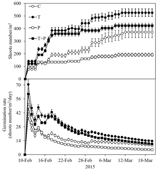 The average number and germination rate of P. crispus shoots during the experiment in 2015. Error bars indicate ± standard error (SE). For abbreviations used, see Figure 2.
