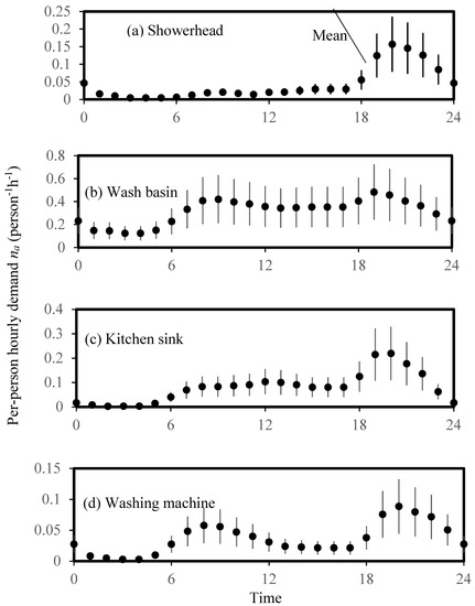 - Murakawa, S.; Takata, H.; Saito, C.; Abe, M.; Toyosada, K. Development of the calculating method for the loads of cold and hot water consumption in a business hotel (Part 2) Dynamic estimation for the loads of cold and hot water demands. In Proceedings of the 41st International Symposium of CIB W062 Water Supply and Drainage for Buildings, Beijing, China, 18–20 August 2015. [Google Scholar]