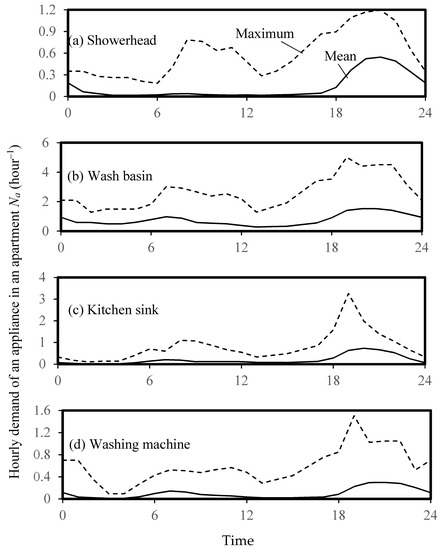 - Murakawa, S.; Takata, H. Development of the calculating method for cold and hot water consumption based on the fixture usage in the time series through a day—A case study of apartment houses. In Proceedings of the CIB W062 International Symposium on Water Supply and Drainage for Buildings, Iasi, Romania, 18–19 September 2002; pp. 1–13. [Google Scholar]