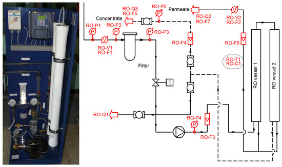 Filtrate from the slow sand filter was fed to small RO filter, which had a pressure booster and a 5 µm cartridge filter of its own. The RO unit contained cross-flow, spiral wound composite (thin film) membranes (manufacturer: General Electric, catalog number: AK2540TM, Boston, MA, USA) in two vessels (Figure 2).