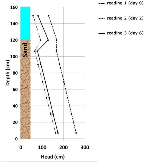 Based on the measured piezometric level differences at different depths in the sand layer of the filter, the pressure distribution (or hydraulic gradient) was calculated along the filter in the form of a Michau (or Lindquist) diagram (Figure 3). The difference shown at a depth of 150 cm above the bottom of the filter indicates different water levels above the surface of the filter (water column of 1.0–1.5 m).