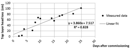 The gradient in the top layer plotted as a function of elapsed time shows an increasing linear tendency (Figure 4). The calculated p-value of the F-test performed to investigate the linear correlation is 1.6 × 10−5. At a 0.05 confidence level, it can be rejected that there is no linear correlation. The error of the slope is 3.86 ± 0.53 cm/d. In spite of the large number of influencing factors, the increase of the gradient indicates an effective rejection of suspended solids and microbial growth.