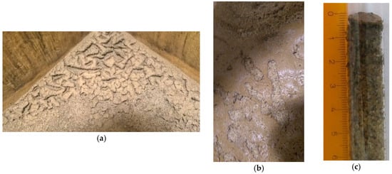 Under the conditions of the experiment, the rate of the resistance build-up was 4 cm/d (cm stands for the measured difference in the piezometric levels). The developed biofilm and boundary layer could be observed with the naked eye after 1–2 weeks of operation (Figure 5a–c). Its thickness was 2–3 mm.