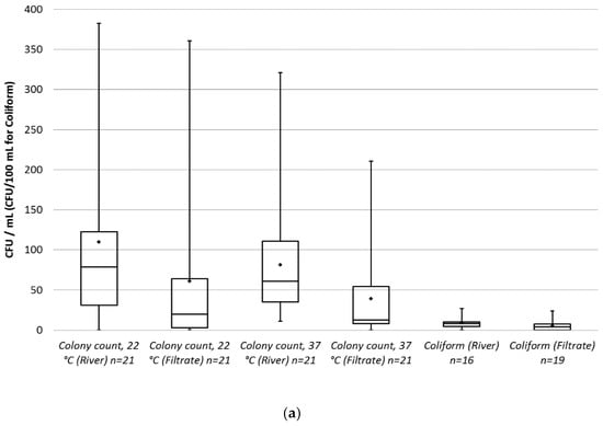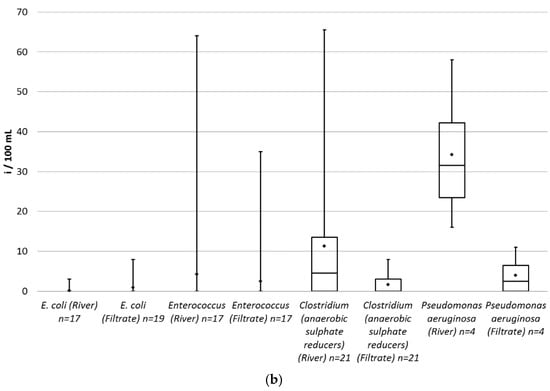 A box plot was created for the measured values of each parameter in the raw and in the filtered water (Figure 6a,b). Some results for coliforms and E. coli were omitted, because four samples could not be analyzed for E. coli by the BUWW laboratory due to the unexpectedly high interference from all other microbiological growth. In case of E. coli and Enterococcus, only 1–3 non-zero results were obtained and only the minimum (0), the maximum and the average are shown on the graph. The number of samples is also given after the name of the parameters.