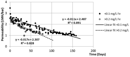 Relationship between permeability with 100 µg/L and 200 µg/L dissolved iron and time (LMH = L·m−2·h−1).