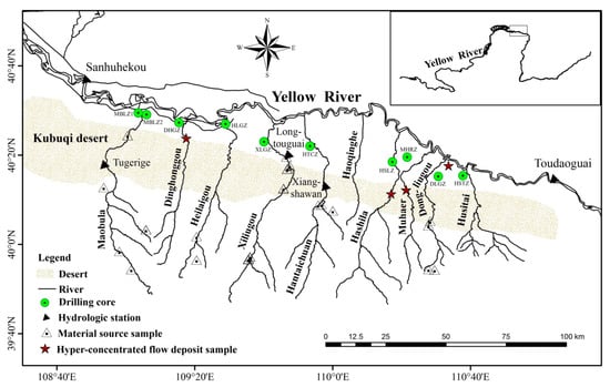 The Ten Kongduis (the transliteration of ephemeral flood gullies in Mongolian), are ten tributaries in the upper reaches of the Yellow River in Inner Mongolia, China. With the hills and gullies in the upper reaches and sand dunes in the middle reaches, and the arid and semi-arid climatic conditions, the kongduis are dominated by the strongly coupled wind and water erosion and the frequent hyperconcentrated flows, giving a large amount of coarse sediment to the Yellow River [31]. Referring to the erosion, most researchers preferred to study the wind and water erosion separately [32,33,34]. However, because of the temporal and spatial interplay superposition of erosion dynamics and diversity of material sources, the aeolian-fluvial interaction exhibits more intense and complex characteristics than single type of erosion in the process of sediment erosion [35], which explains the large amount of coarse-grain material that enters the Yellow River from the watersheds with wind-water coupled erosion [36]. For the Ten Kongduis, Lin et al. [37] estimated the average annual sediment discharge of these rivers to be 193.9 × 104 t/a during 1951 to 2010. The contribution of the Ten Kongduis to the sediment deposition of channel in the Bayagaole—Toudaoguai reaches of the Yellow River increased from 50.5% in 1954 to 87.8% in 2000 [38,39]. With the input of a large amount of coarse sediments, the riverbed and floodplain materials become coarser downstream the confluences of the Ten Kongduis [9]. At present, most research efforts have focused on the qualitative descriptions of the relationships and principles of the aeolian–fluvial interplay erosion [40,41], with few identifying the sources of sediment. Meanwhile, due to the lack of data (except Zhang et al. [36] who studied one of the kongduis, the Dongliugou Kongdui), no one has investigated the composition of sediment grain size, the contributions of sediment sources, and the grain-size fractions of outputs to the Yellow River for both the sediments carried by the hyperconcentrated flows and ordinary sediment-laden flows of the Ten Kongduis.