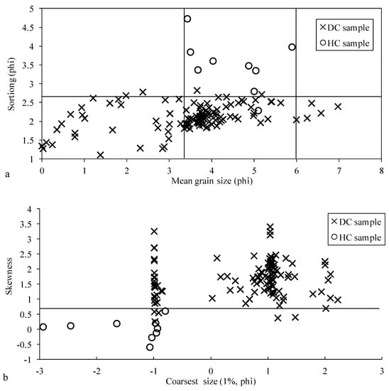 The Mz-σ (a) and C-SK (b) diagrams for deposit samples of the Ten Kongduis. DC sample—Drilling core sample; HC sample—Hyperconcentrated flows deposit sample.