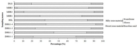 As mentioned above, the samples of hyperconcentrated flow deposits have almost the same grain size composition as the input sediment. Therefore, we can use Equation (1) and the method mentioned in Section 3.2 to calculate the sediment sources. The results are shown in Figure 3. In order to examine the results, we calculated the percentages of grain size fractions at the outlets of the kongduis with the estimated contributing ratios of sources, and found that they are nearly same as those of the hyperconcentrated flow deposits with a maximum relative error of 1.46%.
