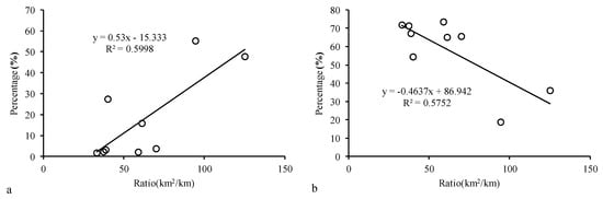 As shown in Table 4 for the sediment carried by non-hyperconcentrated flows, the proportion of sediment yield from pisha strata is different between kongduis. It is about 50% in the Maobula and Hashila kongduis, and less than 30% in the rest kongduis. The difference of the proportion of sediment yield from the pisha strata between kongduis may result from the different ratios of upper drainage areas to the width of desert in middle reaches of the kongduis, as shown in Figure 4a. The proportions of sediment yield from the desert in the middle reaches are in the range of 12.78%–73.38%, and the proportion of sediment yield from the desert is also related with the ratio of upper drainage areas to the width of desert (Figure 4b).