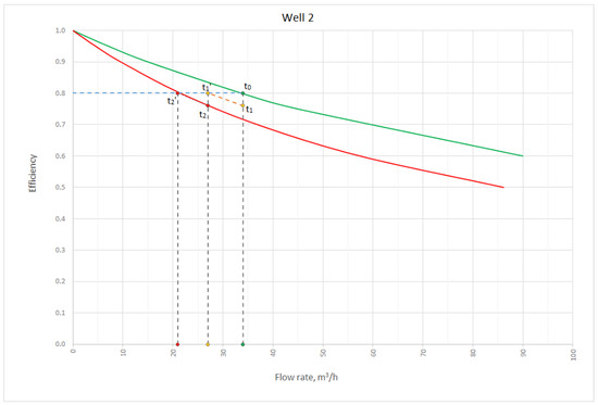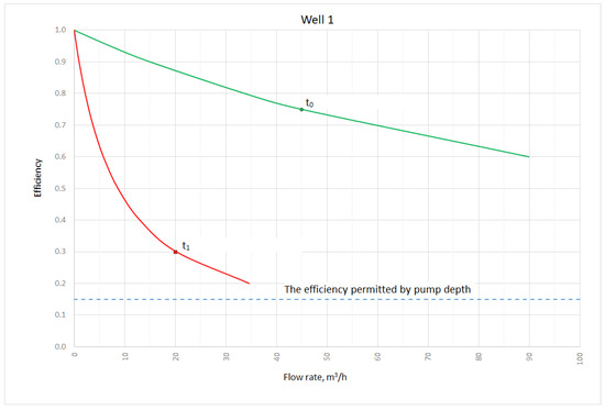 It should be noted that flow rate was significantly reduced for both wells. Currently, Well 1 is used occasionally due to high operating costs, while the costs of water extraction from Well 2 are approximately 65% lower. In addition, Well 2 operates at an efficiency which guarantees its reliable operation in the long term. The efficiency values, which are marked green and red in Figure 2 and Figure 3, were confirmed by step drawdown tests. In practice, efficiency compensation in the second case was achieved by valve throttling at the beginning of operation and replacing the pump unit type series at appropriate time [16].