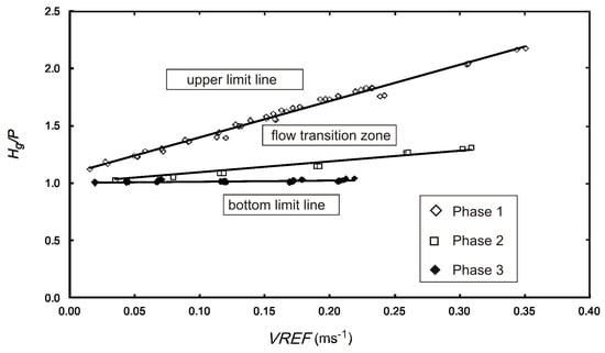 Because a control section has different hydraulic conditions compared to the recommended pipe for area velocity, the water level and flow velocity measured by area velocity required the determination of calibration curves or the elaboration of formulas, which enabled the measurement of values with respect to the reference values. Previous research [,] has proven a good agreement between control section water levels measured by AV and REF values. A differential pressure transducer of an AV probe is characterized by good accuracy and precision of measurement. However, there is an essential variance between the measured AV velocity values and the reference values controlled by a laboratory system. The diameter of the measuring (pipe) section and minimum water level determined by the outlet weir are the parameters which have the greatest impact. Another significant problem includes the variable hydraulic conditions in the drainage pipe system flow: The transition from a partially filled up drain with no pressure through a completely filled up drain still without pressure to a completely filled up drain pipe working with pressure. Assuming these three flow phases, velocity average values VREF related to dimensionless pipe filling (Hg/P) were elaborated (Figure 1). The calculated average values of VREF flow related to dimensionless pipe filling (Hg/P) formed three lines arranged in a circular fashion. The P value equalled the Pg value for the free flow phase, otherwise it was equal to the Hd value. The presented graph shows the three flow phases defined earlier. The upper limit line reflected Phase I flow conditions (Scheme 2a). A flow transition zone is placed between the limit lines. Points situated in this area represent the change of the free flow form with the outflow weir submergence to pressure flow (Scheme 2b). Points representing transient flow (Phase II) gather along lines within the considered zone. The position of these lines depends on the submergence of the weir. Points marked as Phase 2 (Figure 1) were obtained for Hd = 0.5D. The bottom limit line was determined using pipe pressured flow values (Scheme 2c).