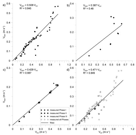 Points marked as Phase 3 obtained for all examined low water levels gather around this line. The limitation of the lower water level Hd has no influence on the pipeline flow velocity. The assumption of flow velocity in a pipe as an analyzing measurement parameter is reasonable because the “Area-Velocity” flow meter option was applied in the software and the discharge was calculated according to average flow velocity (the AV software also has different options of discharge calculation, for example, Manning formula or two-term polynomial equations) []. Thus, the aim of the further analysis was the determination of the actual flow velocity in the control section. It was assumed that the actual velocity was equal to the velocity measured by the laboratory flow meter (VREF) and the independent variable was the velocity measured by area velocity (VAV). The relationship between the actual and the measured velocity values is presented in Figure 2.