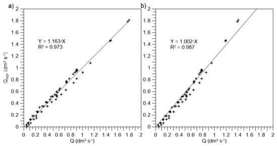 The relationship between the measured (QREF) and the discharge values calculated using Equations (1) and (4) is presented in Figure 3. For an accurate evaluation of the considered relationship, the following statistical criteria were applied: The maximum error value (ME), the root-mean-square error value (RMSE), the coefficient of determination value (CD), and the coefficient of residual mass value (CRM) []. The ME value is the maximum difference between the observed and the calculated value and indicates the worst case calculated by equation. The RMSE value indicates to what extent the calculations are over- or underestimating the measurements, expressed as a percentage of the averaged value of the measurements. The CD describes the ratio between the scattering of the calculated values and the scattering of the measurements. The CD value proves the dynamics in the measured and calculated values’ agreement.
