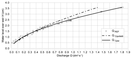 All the specified statistics proved that the best results were obtained for the values calculated by the California pipe outlet weir method (Figure 3b). It can be assumed that the discharge values calculated with this method were very close to the measured (reference) values. The worst results were given by the Cipolletti equation. Thus, the obtained results were underestimated by about 16% in relation to the reference discharge values (Figure 3a). Discharge curves calculated by Equations (1) and (4), as well as measuring points, are presented in Figure 4. It can be noted that the most appropriate equation for the calculation of the discharge free flow case was the California pipe outlet weir method. The Cipolletti formula is not recommended for the calculation of discharge in the considered case.